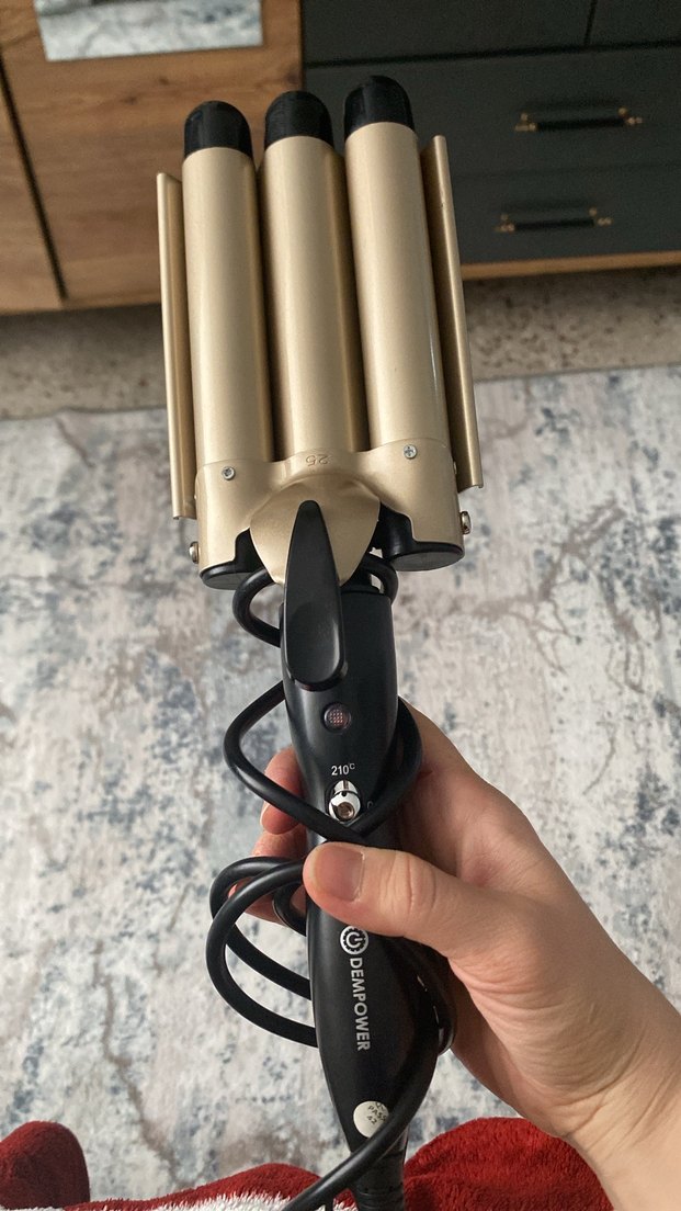 210°C'ye kadar ayarlanabilir sıcaklık kontrolü olan bej renk üçlü saç maşası, dalga ve bukleler için uygundur.