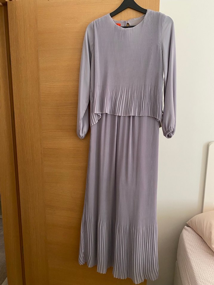 Bej renkli, uzun kollu, pilili detaylara sahip, salaş kesim ve yuvarlak yakalı keten kumaştan kadın elbisesi. Minimalist tarzda, günlük kullanım için uygundur.