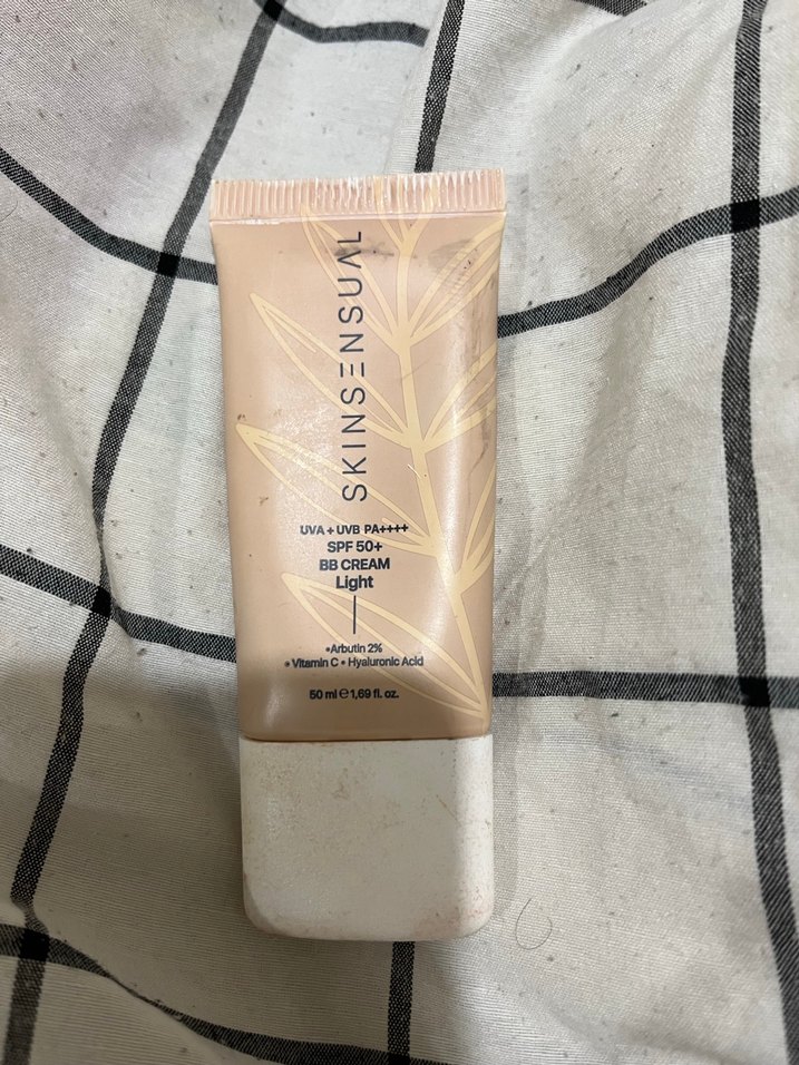 Bej renkli, açık ton BB krem, SPF 50+ koruma sağlar, vitaminler ve hyaluronik asit içerir.