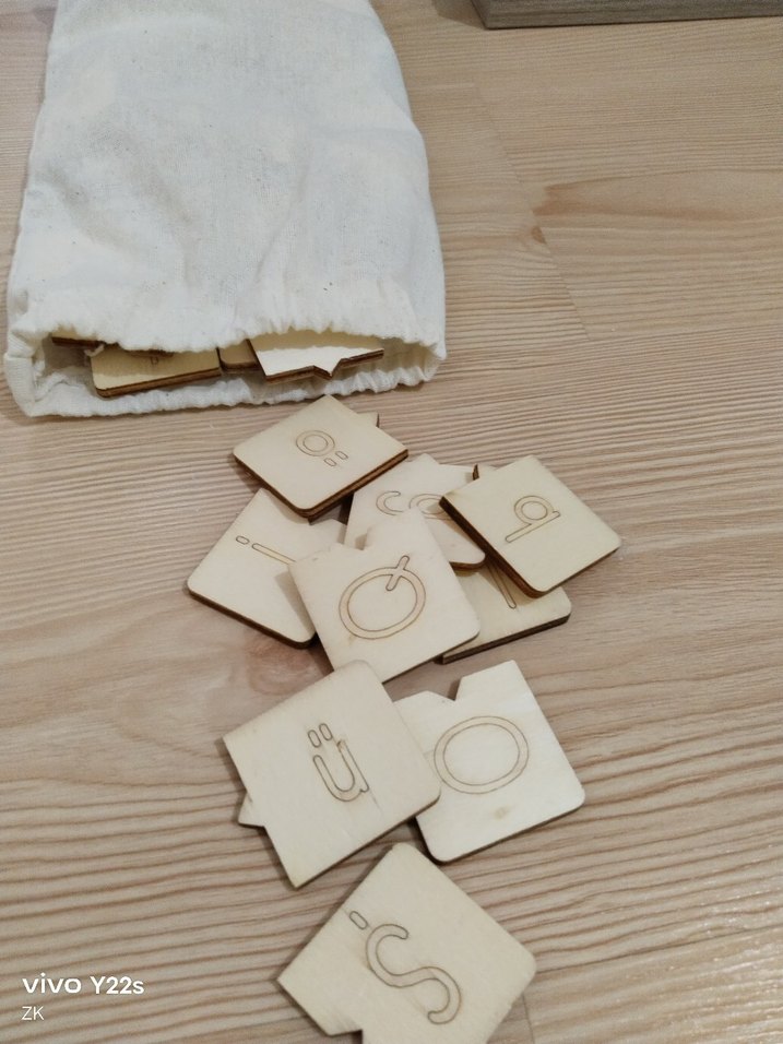 Bej renkli, üzerinde harfler kazınmış ahşap harf parçaları, yumuşak kumaş torbada saklanmaktadır. Eğitim amaçlı oyunlar için uygundur. Okuma yazma öğretme sürecinde bana çok yardımcı oldu.Alana şans getirsin Markası zara değildir butik bir işletmeden almıştım.