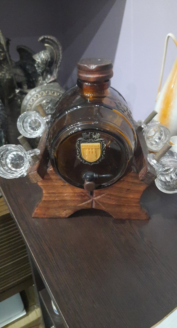 Koyu renkli, bej tonlarında şişe, ahşap taban üzerinde durur ve küçük bir musluk içerir. Yanlarında dört adet şeffaf cam tutucu bulunmaktadır.