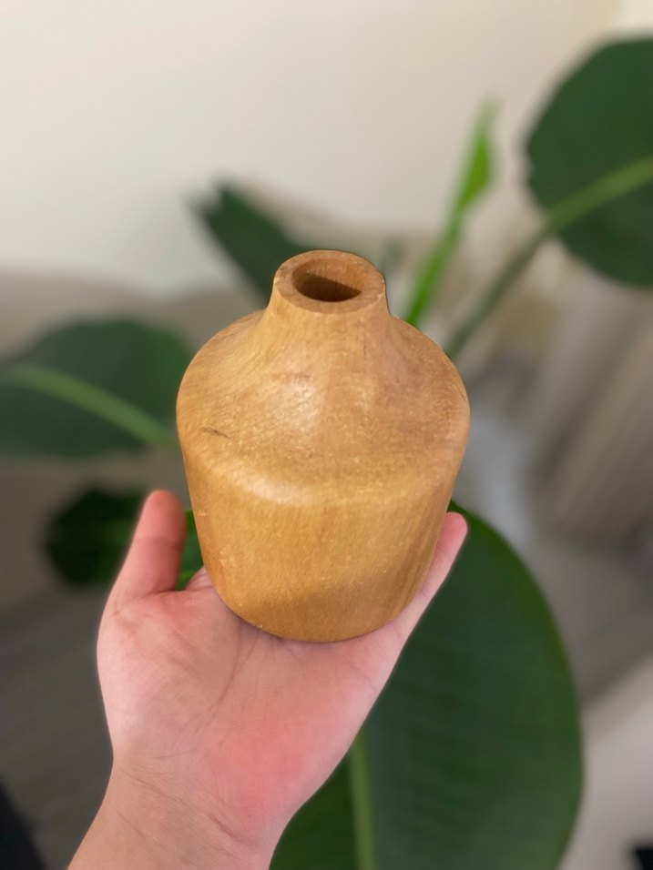 Pürüzsüz yüzeyli, dar ağızlı küçük bej ahşap vazo, minimal dekor için uygundur.