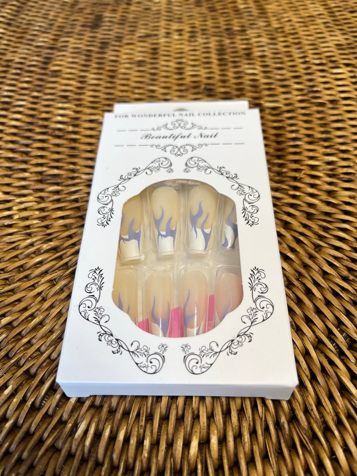 Bej renkte, canlı alev desenli yapay tırnaklar. Tırnak süsü için şık ve dikkat çekici bir tasarım. 24 adet tırnak 24 adet yapıştırıcı bir adet törpü