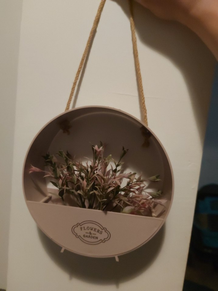 Bej pastel renkte, ip askılı, yapay çiçeklerle süslenmiş dekoratif asılabilir çiçeklik. Mekâna yumuşak bir dekoratif dokunuş katar.