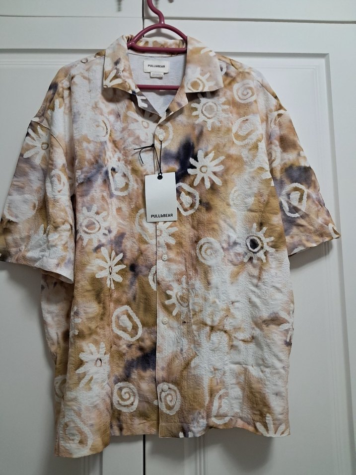 kısa kollu ve yakalı, bol kesim erkek gömlek. Bej tonlarında bağlama desenli, düğmeli ve günlük rahat tarz için uygun.