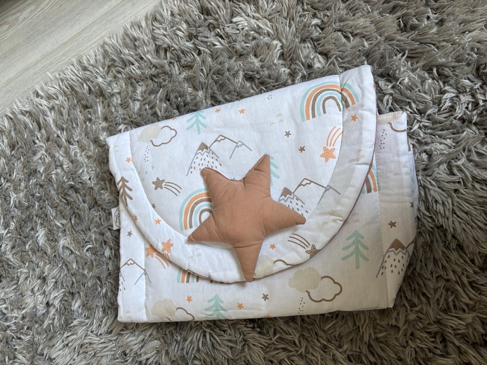 Pastel renklerde gökkuşağı, yıldız ve dağ desenli bej çocuk alt değiştirme örtüsü.Yumuşak ve sıcak kumaştan, yıldız şeklinde detaylı.