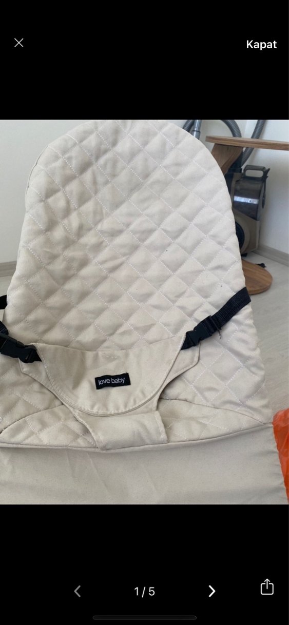 Ayarlanabilir siyah kayışlara ve kapitone görünüme sahip bej renkli bebek taşıma slingidir.