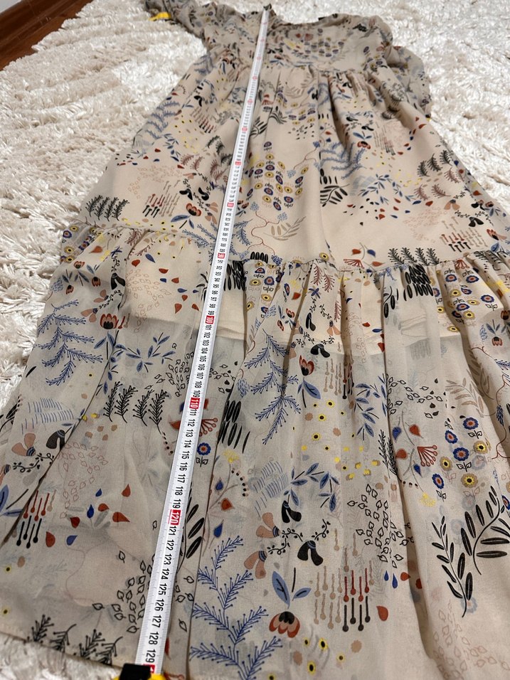 Açık bej renkli, bol kesim ve fırfır detaylı midi elbise. Kayık yaka ve askılı kollara sahip, baskılı bitki desenleriyle süslenmiştir. Bohem tarz için uygun.