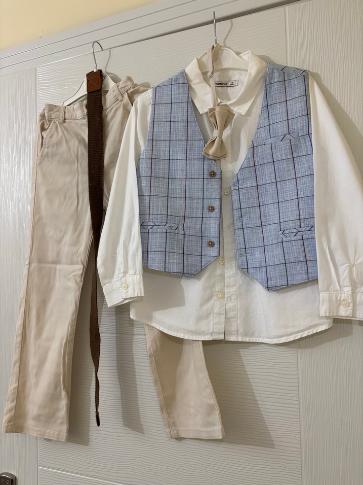 Bej renkli gömlek, düğmeli ve pastel tonlarda kravat desenli yelek ile kombine edilmiş çocuk takımı. Gömlek askılı kolludur, bohem tarzda rahat ve şık.