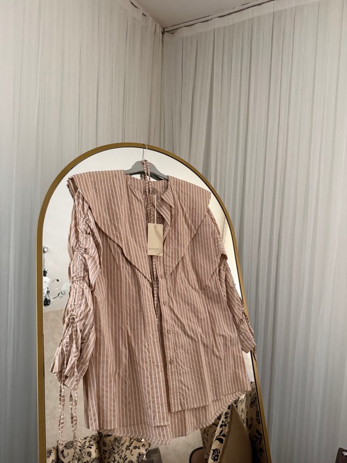 Bej renkte, keten kumaştan yapılmış, bol kesim, uzun kollu, yakalı ve fırfırlı detaylara sahip bohem tarzda gömlek.