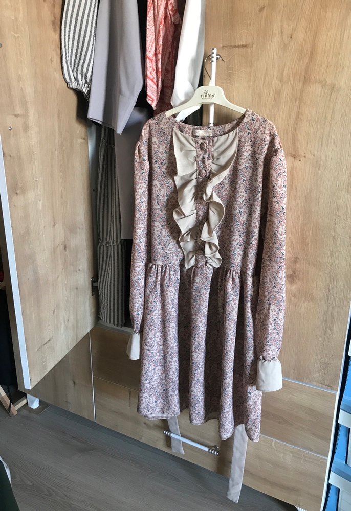Bej pastel renkte, uzun kollu, yüksek yakalı ve ön kısmında fırfır detaylı bol kesim uzun triko elbise. Bohem tarz için uygun.