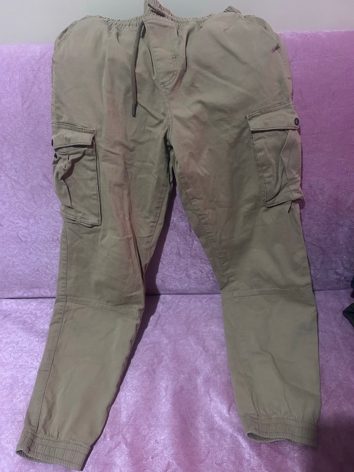 Bej renkli, kemerli ve bol kesim erkek pantolon, yumuşak sentetik kumaştan. Çok cepli, dış mekanlarda rahat kullanıma uygun. Kardeşimin boyu 1.80 ona kısa oluyor 1.75 boy için uygun