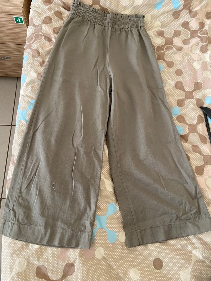 Bol kesim, keten kumaştan, pilili ve lastikli bel detaylı bej pantolon. Rahat ve günlük kullanıma uygun. Marka temsili