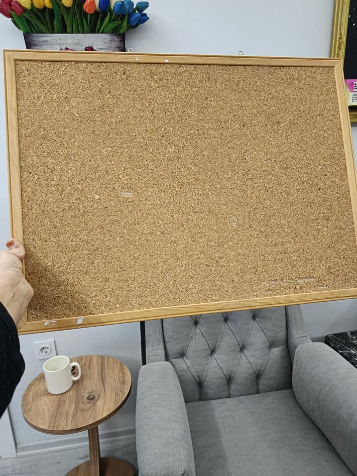 Işıltılı yüzeye sahip büyük, bej renk mantar pano, hafif ahşap çerçeveli, not veya fotoğraf asmak için uygun. olçusu 45e 60