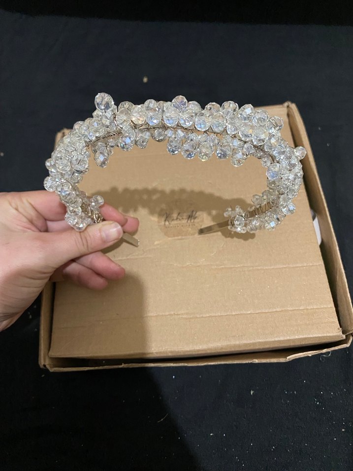 Bej renkte, camdan yapılmış payetlerle süslenmiş saç tacı. Minimalist ve bohem tarzı yansıtır, retro ve hippie stiller için uygundur.