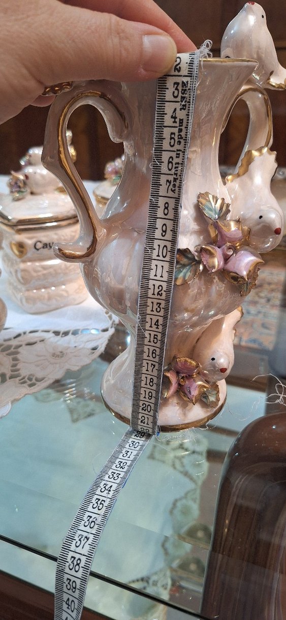 Bej renkte, çiçek detaylı ve parlak yüzeye sahip, yaklaşık 30 cm yüksekliğinde vazo.