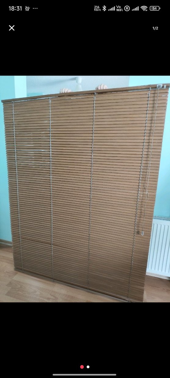 Kahverengi, ahşap görünümlü şık metal jaluzi perde. Ölçüleri 140 cm (En) x 180 cm (Boy)'dur. Standart pencere ölçülerine uygundur. Ofis, mutfak veya balkon kapıları için kullanılabilir. Özellikleri: ✅ Malzeme: Metal (Dayanıklı ve kolay temizlenir). ✅ Renk: Kahverengi / Ahşap tonu. ✅ Mekanizma: İpli açma-kapama mekanizması sorunsuz çalışmaktadır. ✅ Durumu: Temizdir, yamuk veya kırık kanat yoktur. Sadece şeritlerin açısını değiştiren şeffaf çevirme çubuğu yoktur (elle veya yedek bir çubukla kolayca ayarlanabilir, kullanıma engel değildir).