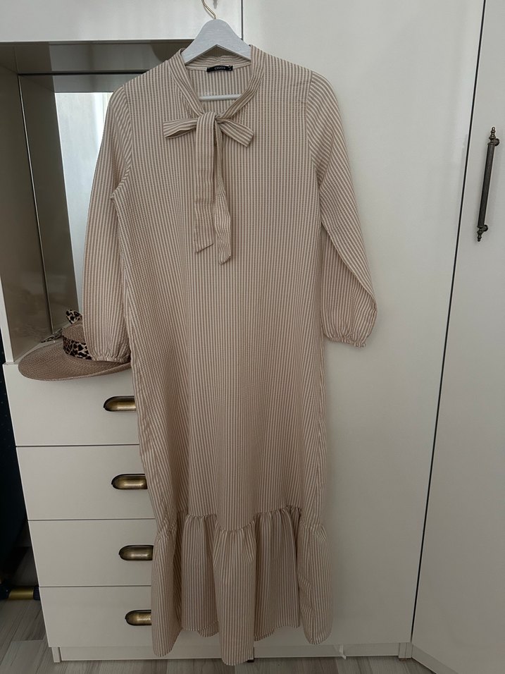 Bej Renkli Çizgili Uzun Elbise