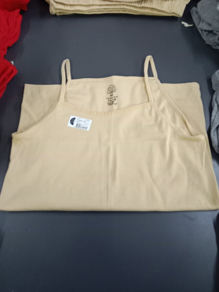 Bej renkli çocuk atleti, ince askılı ve hafif, düz dokulu kumaştan üretilmiştir.