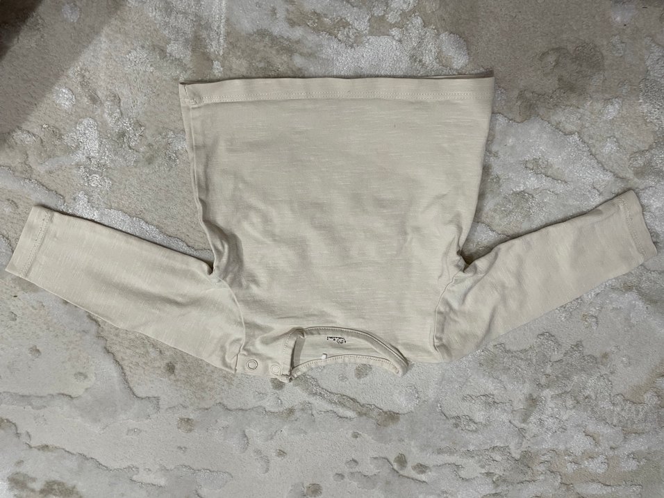 Yumuşak bej renkli çocuk bluz, uzun kollu ve kolay giyilebilmesi için yakada çıtçıtlı. Rahat ve düz tasarım.