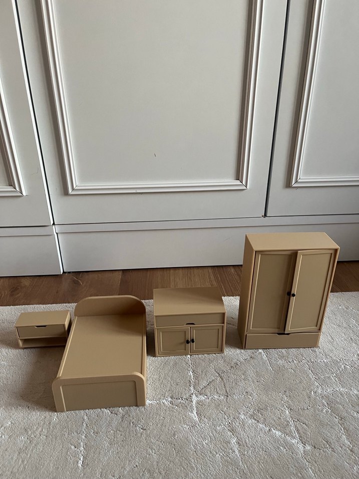 Bej renkli çocuk oyun mobilyası seti, yatak, komodin ve gardırop içerir, hayal gücünü destekler. ️