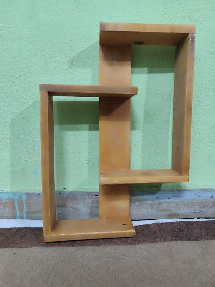 Bej renkli çocuk rafı, iki dikdörtgen bölmeli özgün geometrik tasarıma sahiptir, çocuk eşyalarını düzenlemek için uygundur.