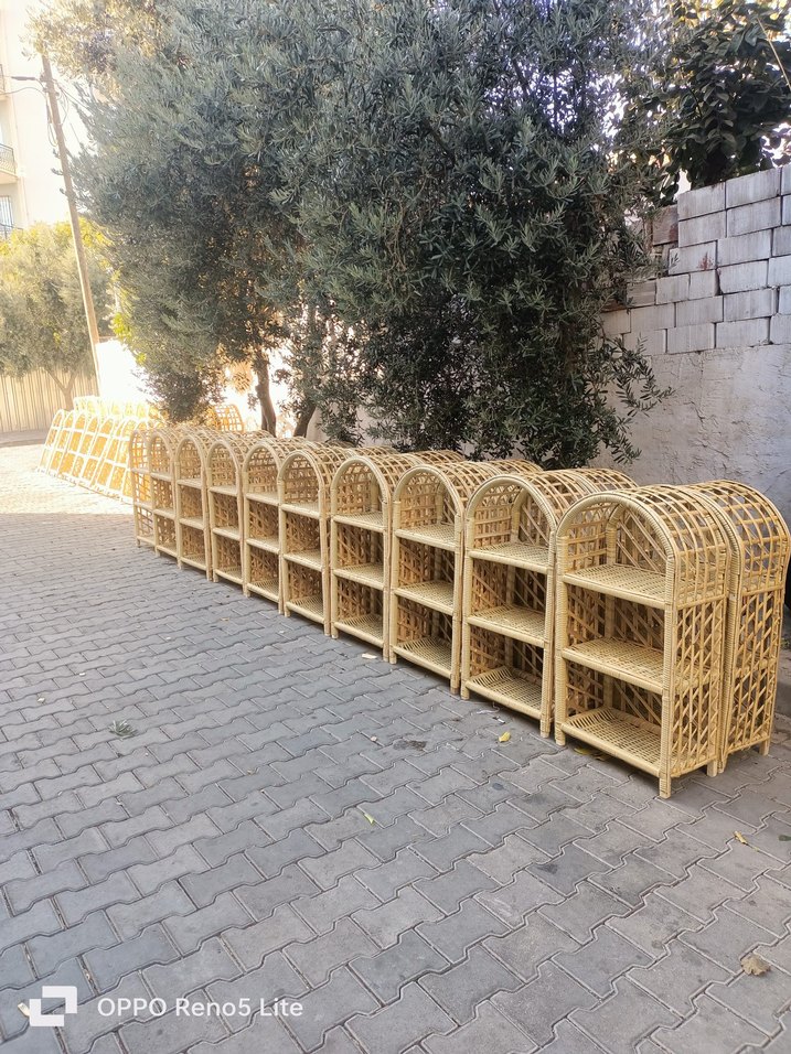 Doğal dokuma malzemeden yapılmış, bej renkli çocuk rafı, çoklu bölmeli ve kavisli üst tasarımlı.