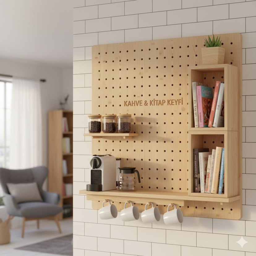 Bej renkte, hafif ahşap dokulu çocuk rafı. Üzerinde 'KAHVE&KiTAP KEYFi' yazısı bulunur. Kitap ve kahve eşyaları için askılıklı düzenleyici. ☕️