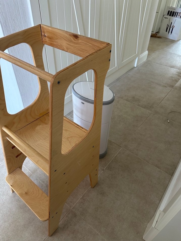 Çocuklar için dayanıklı, basit tasarımlı bej renkli ahşap sandalye. Öğrenme kulesi, çok az kullanıldı hiç bi hasarı yok