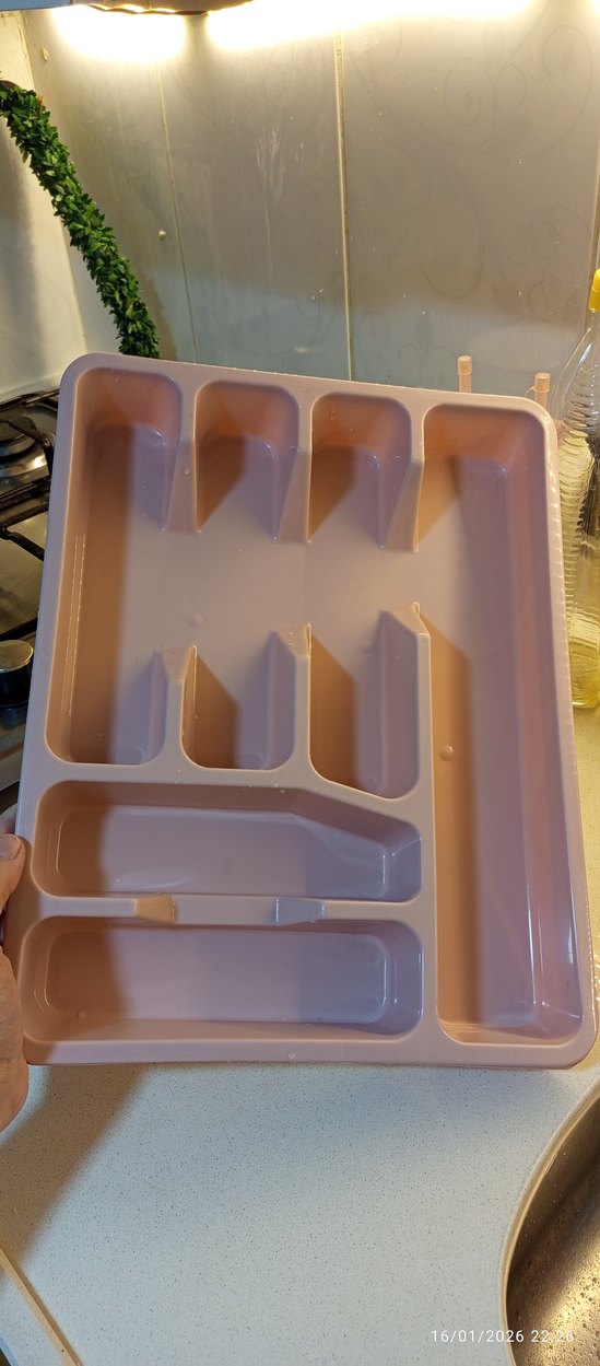 Çatal, bıçak ve kaşıkları düzenlemek için çok bölmeli bej renkli çatal kaşık kutusu. Açık renk ve kullanışlı tasarım.