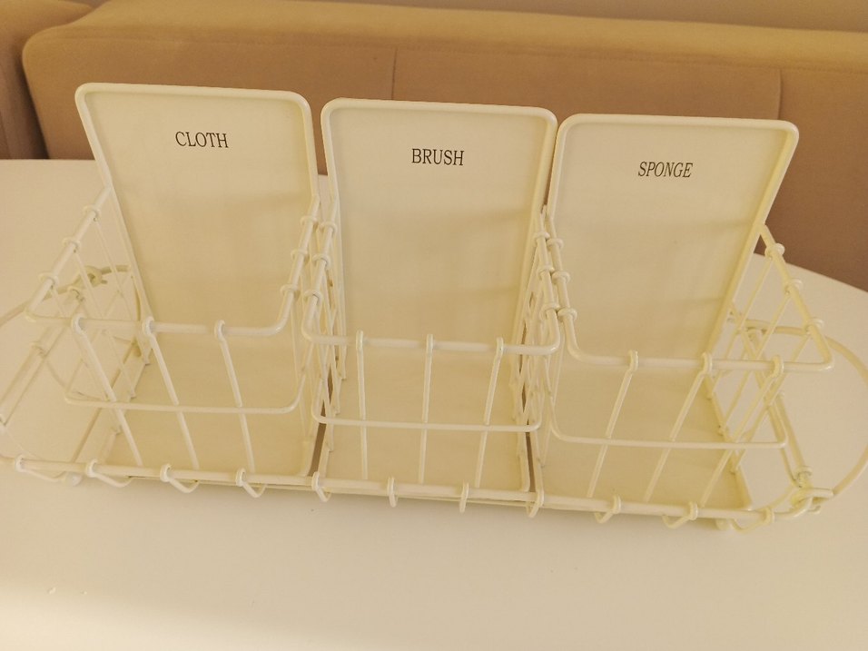 Bej renkte, fırça, kaşık ve diğer eşyalar için etiketli çok bölmeli dolap düzenleyici. Eşyaları düzenli tutar.