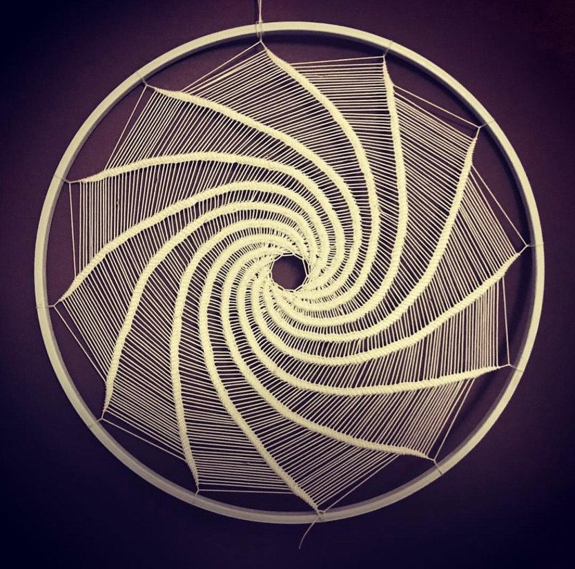 Bej renkli, spiral ip tasarımlı dairesel duvar dekoru, ev dekorasyonuna farklı bir hava katıyor.