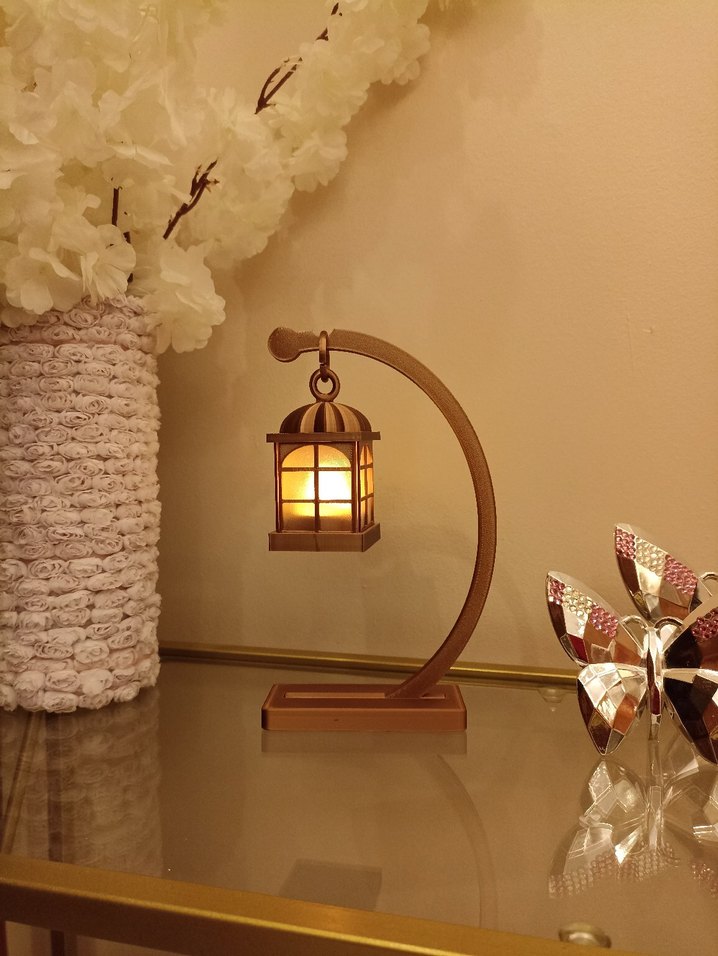 Kavisli ayaklı ve küçük fener tarzı mumluklu, sıcak bir atmosfer oluşturan bej renkli dekoratif mumluk. ️