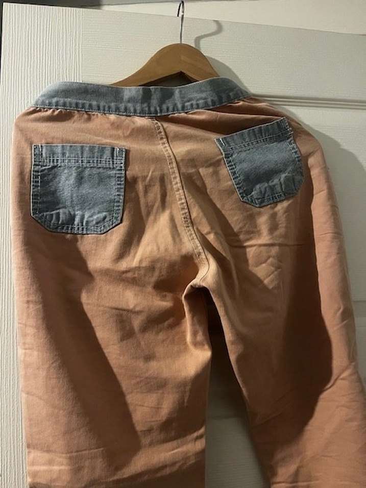 Bej renkli, düğmeli, bol kesim denim boyfriend pantolon. Kontrast cepler ve yaka detayıyla günlük sokak stiline uygun.