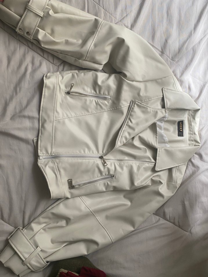 Fermuarlı cepleri ve kesimli yapısıyla bej deri kadın ceket, normal midi uzunlukta ve uzun kolludur. Günlük ve sokak stiline uygun şık bir parça.