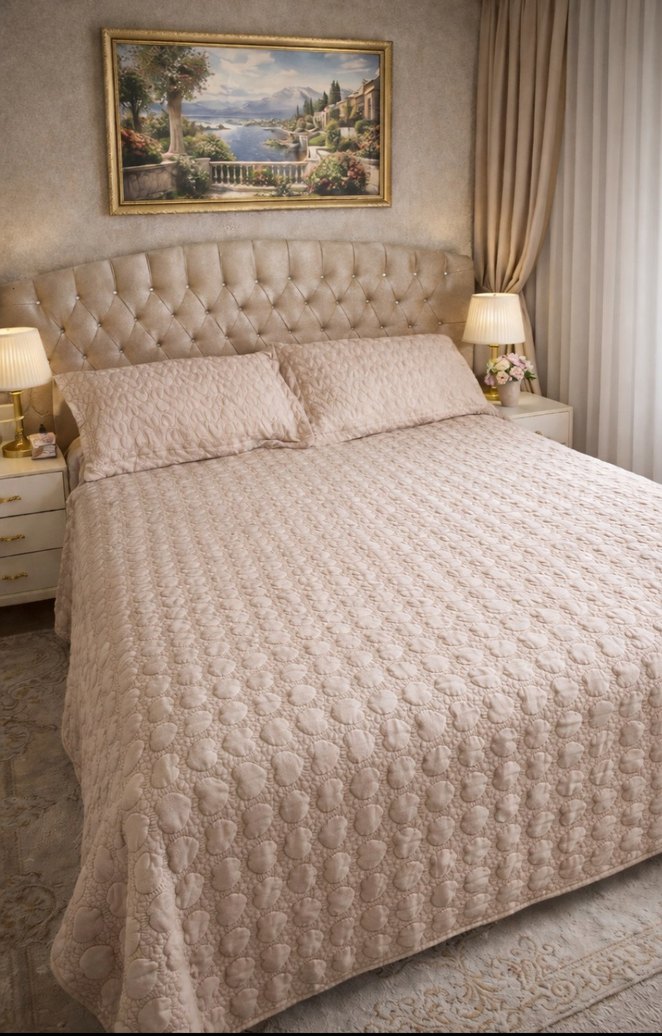 Bej renkli, dokulu detaylara sahip yatak örtüsü, yumuşak ve pastel tonlarda. Yatağı tamamen kaplayarak odaya sıcaklık katıyor. ️