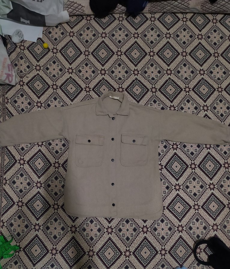 Bej renkte, düğmeli, uzun kollu, yakalı ve rahat kesim kadın gömleği. Günlük ve sokak tarzı için uygundur. erkekte giyebilir marka temsilidir