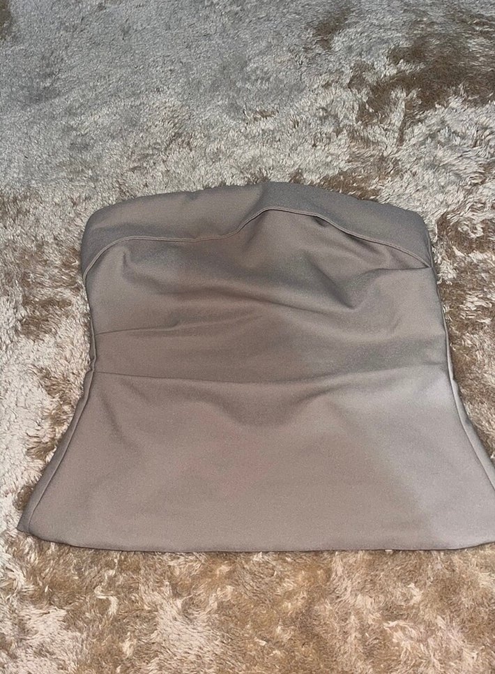Bej renkli, düz desensiz ve yumuşak dokulu bir straplez bluz