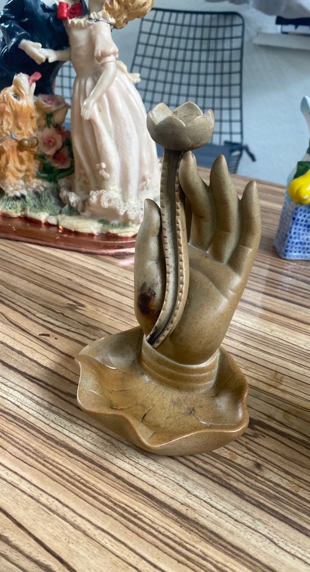 Bej renkte, lotus şeklinde mumluk tutan el formunda şık ve sanatsal bir mumluk. Tütsü