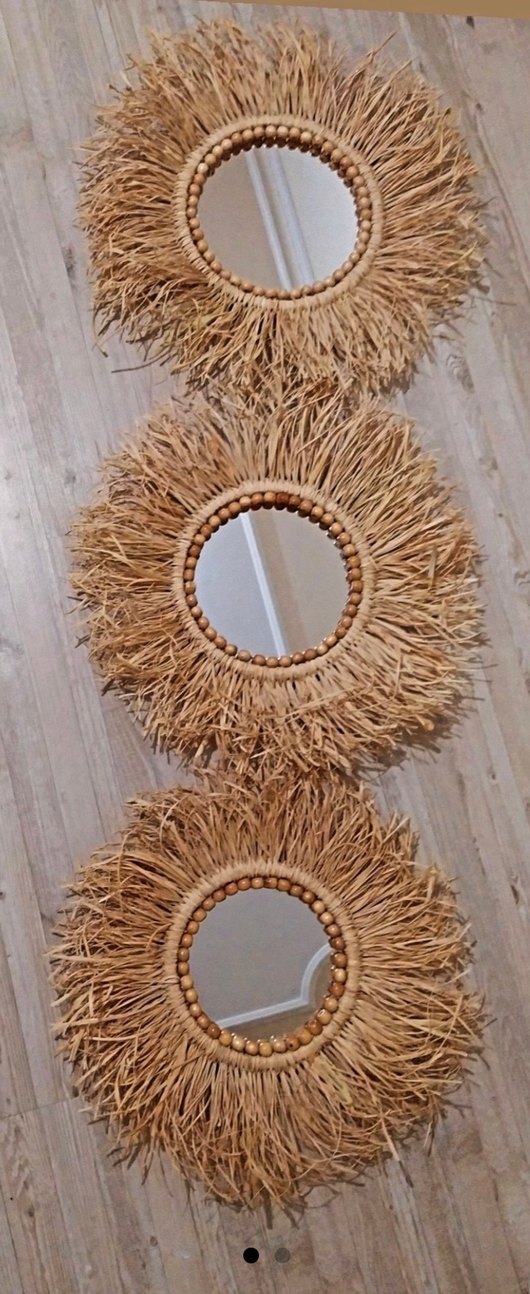 Bej renkte, doğal dokuma malzeme ve ahşap boncuklu parlak çerçeveli yuvarlak aynadır. İsteğe özel çoğaltılıp boyutlandırılır.