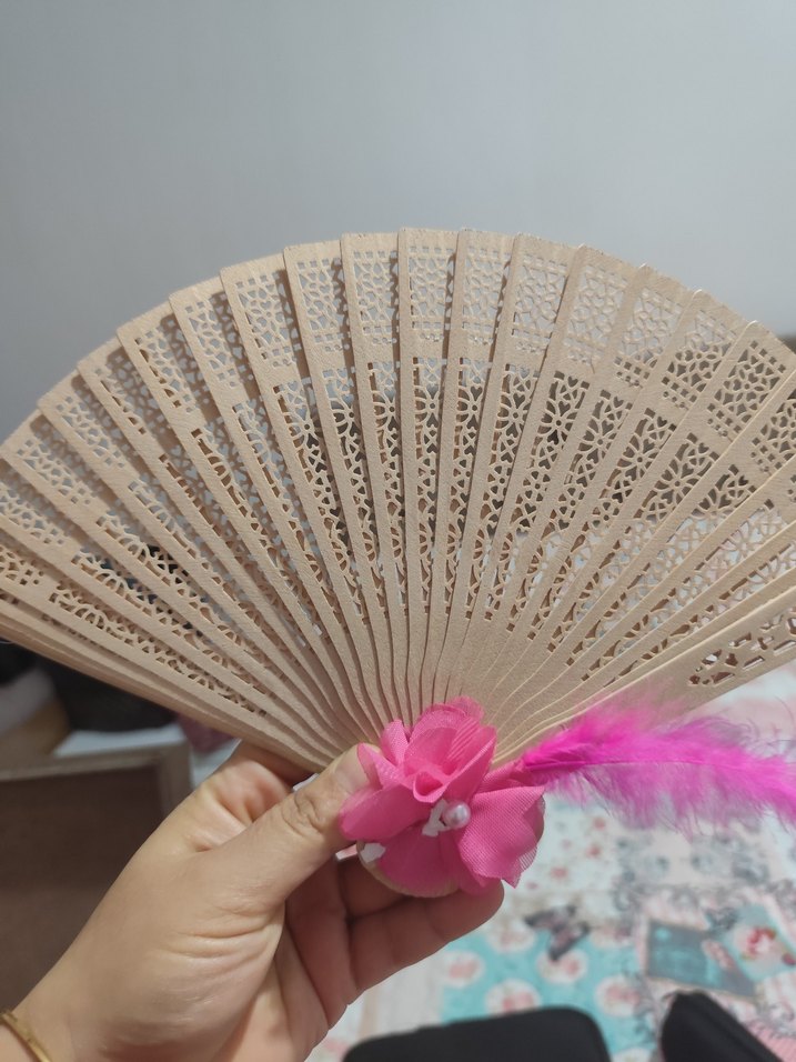 Hafif bej renkte, detaylı oyma desenlere sahip el yelpazesi. Pembe çiçek ve tüy süslemeli.