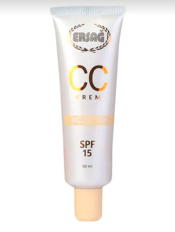 ERSAG CC krem, bej renkte, 50ml tüpte SPF 15 koruma sağlar ve hafif kapatıcılık sunar.