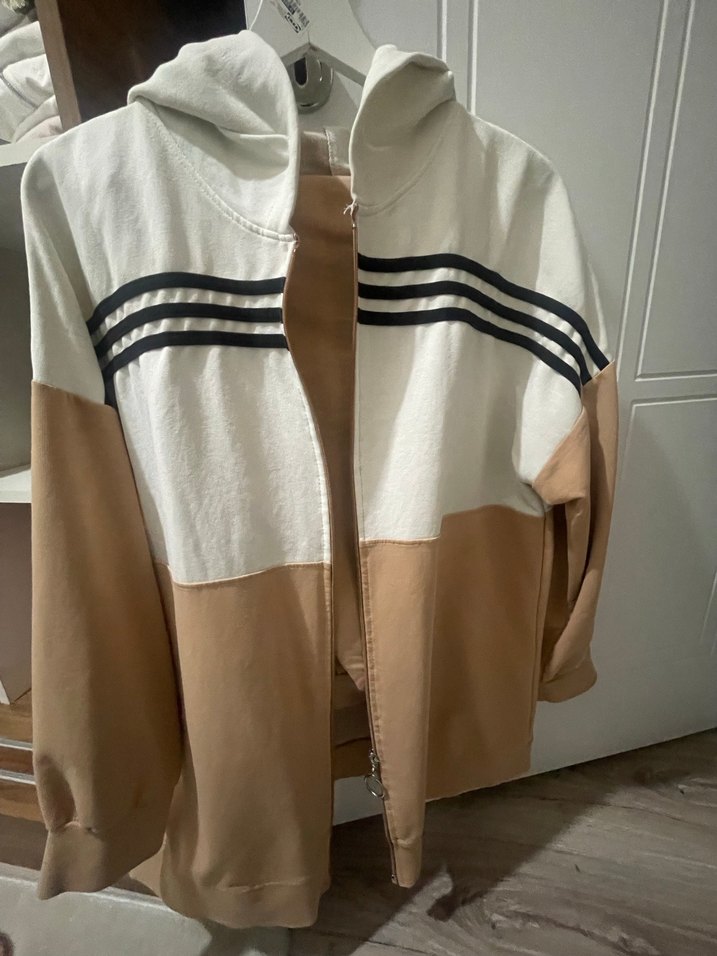 Bej renkli, pamuklu, uzun kollu, fermuarlı, bol kesim kadın sweatshirt. Sokak stili için uygun, sade renk bloklu tasarım içerir.
