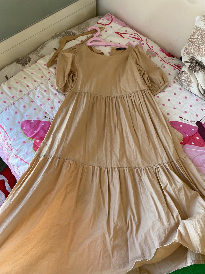 Bej renkli, keten kumaştan uzun elbise. Kısa kollu, bol kesim ve fırfırlı detaylara sahip, bohem tarzda, günlük kullanıma uygun. Xs/s