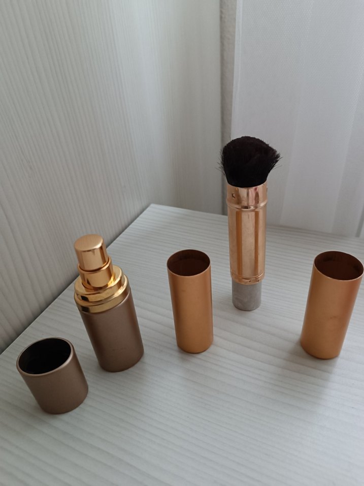 Bej renkli, yumuşak kıllı makyaj fırçası. Metalik sap ve koruyucu kapağa sahip, kullanımı kolay tasarım. takim olarak da kapakli parfüm şişesi. ️