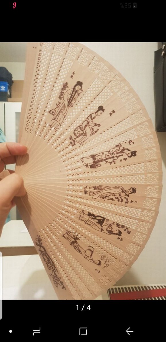 Bej renkte, ince oyma desenlere ve klasik figürlere sahip geleneksel el yelpazesi.