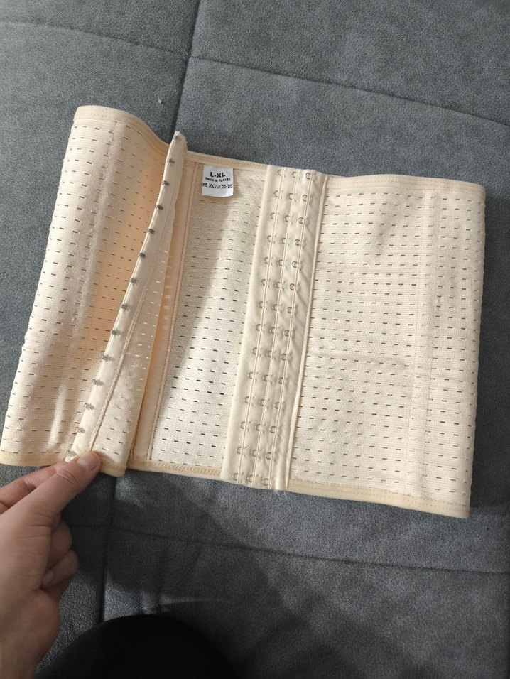 Bej renkte, göğüs korsesi. Midi boyda, vücuda oturan kesim ve ayarlanabilir çoklu çıtçıtlar bulunur. Desensiz ve pürüzsüz dokulu.
