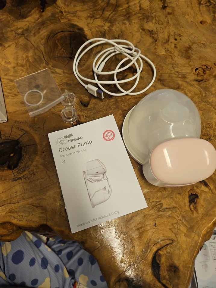 Bej renkli göğüs pompası seti, manuel parçalar ve USB kablosu ile kolay kullanım sağlar. Talimatlar ve aksesuarlar dahildir.