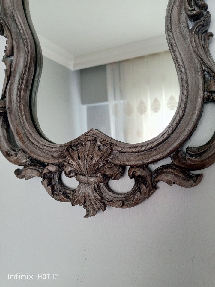 Bej ve gri renklerde, detaylı işlemeli klasik görünümlü dekoratif ayna.