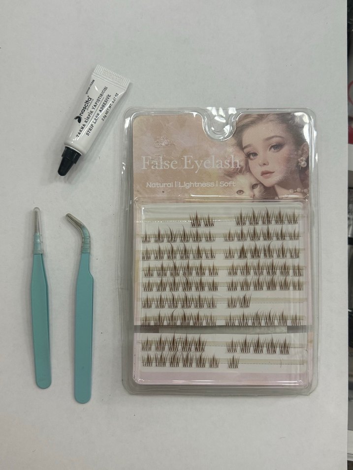 Bu set, yapıştırıcı ve uygulama aparatlarıyla birlikte hafif bej renkli takma kirpikler içerir. Kirpikler doğal hacim ve uzunluk sağlar.